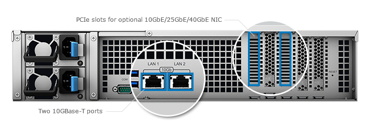 FS3017 內(nèi)建雙 10GBase-T 網(wǎng)絡(luò)端口。當(dāng)你需要更多的帶寬時,可透過兩個 PCIe 插槽新增額外的網(wǎng)絡(luò)控制器,也可選擇 10GbE、25GbE 與 40GbE 網(wǎng)絡(luò)適配器以發(fā)揮 FS3017 的效能。此外,通過額外購買 FS3017 支持的網(wǎng)絡(luò)適配器,iSCSI over RDMA 技術(shù)更可進一步強化約 80% 的 iSCSI 效能。