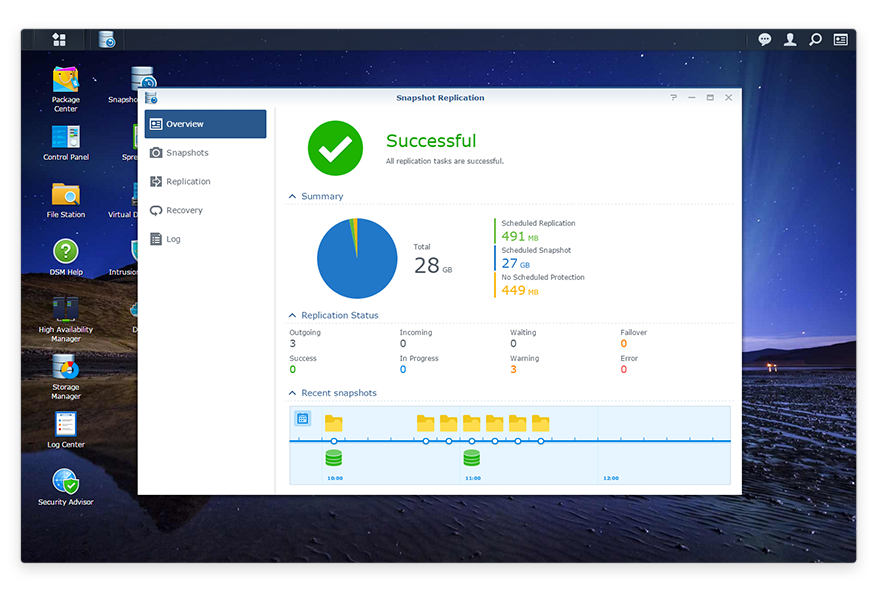 Synology DS916+ 可作為一個(gè)集中化的備份目的地。無(wú)論你是 Windows 或 Mac 使用者,你都可以使用 Cloud Station Backup 直接將電腦中的文件備份到你的 Synology NAS,任何時(shí)候做的修改都會(huì)自動(dòng)備份到 DS916+。Mac 使用者也可享受熟悉的 Apple® Time Machine 備份經(jīng)驗(yàn) 。你也可以將 DS916+ 上的數(shù)據(jù)備份到另一臺(tái) DiskStation、其它 rsync 兼容服務(wù)器、外接設(shè)備,甚至是 Amazon® S3、Glacier cloud service、Microsoft Azure、SFR 和 hicloud 等公有云服務(wù)。Synology Hyper Backup 讓你可運(yùn)行備份任務(wù)排程,以及將服務(wù)器回復(fù)到過(guò)去特定的時(shí)間點(diǎn)。同時(shí),不同版本間只備份經(jīng)過(guò)修改的數(shù)據(jù),以降低消耗的存儲(chǔ)空間和處理時(shí)間。