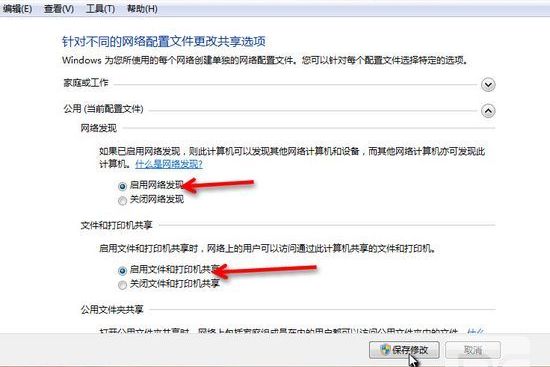 選擇 公共網(wǎng)絡(luò)---選擇以下選項(xiàng):?jiǎn)?dòng)網(wǎng)絡(luò)發(fā)現(xiàn)------啟動(dòng)文件和打印機(jī)共享-----啟用共享以便可以訪問(wèn)網(wǎng)絡(luò)的用戶可以讀取和寫(xiě)入公用文件夾中的文件(可以不選)----關(guān)閉密碼保護(hù)共享( 注釋:其他選項(xiàng)默認(rèn)即可!)